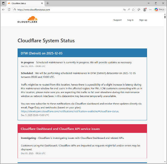 Cloudflareのステータスページには「Cloudflare DashboardとAPIで問題が発生した」と記されています。