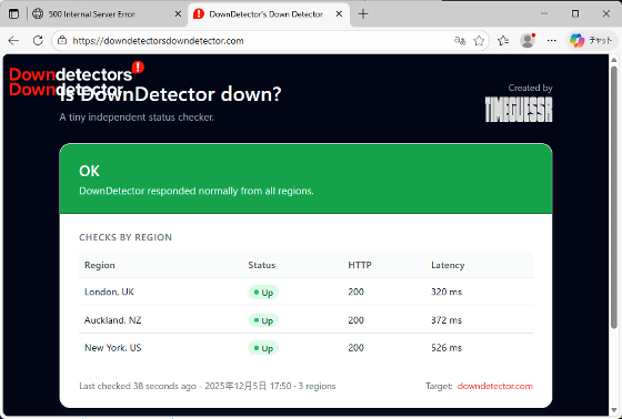 ちなみに、DownDetectorの死活を監視するDownDetector’s Down Detectorでは「OK」と表示されています。うまく機能していないようです。