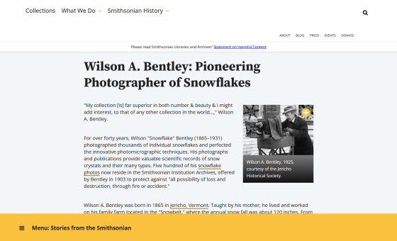 ベントレーは1903年、撮影した写真のうち500枚を火災や事故による損失から保護するため、スミソニアン博物館に寄贈しました。記事作成時点では、スミソニアン博物館のウェブアーカイブでこれらの写真の一部を見ることができます。