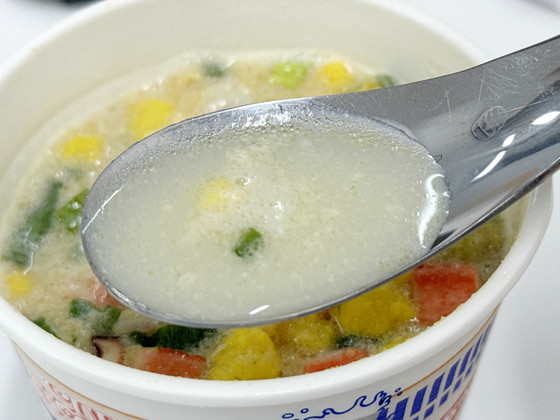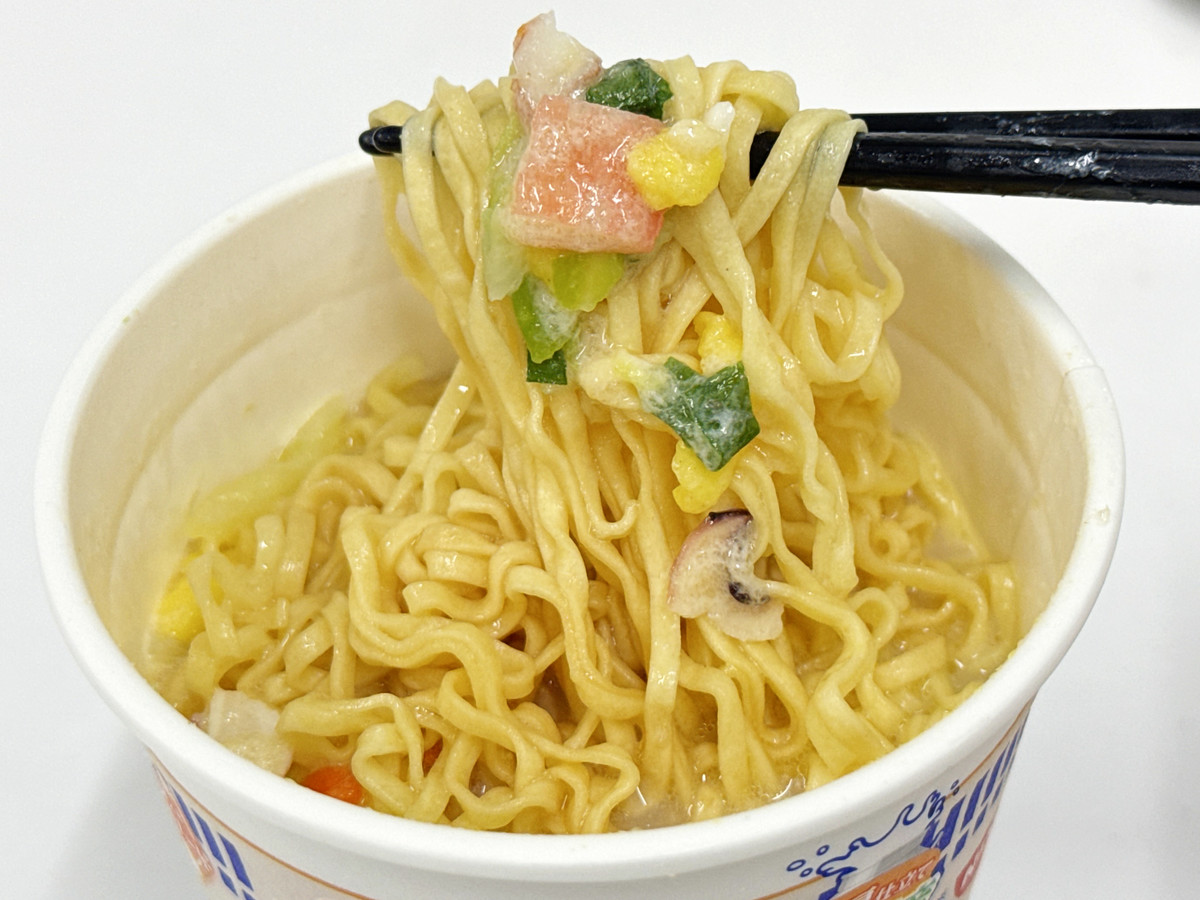 麺はいつもと同じで、つるみのあるしなやかな麺。また、3分待ってから箸でよく混ぜたのですが、粉乳とおぼしき白い粉末は半分溶けたくらいで残っており、これがとろけたチーズのようになって麺によく絡みます。うま味が強く味の余韻も残り、食べ応えも十分で、寒い時に食べるにはぴったりなカップヌードルでした。