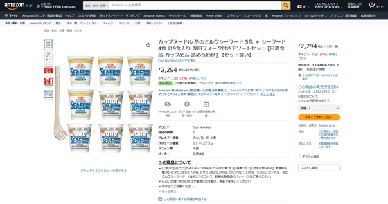 カップヌードル 冬の濃厚ミルクシーフードヌードルは2025年12月8日から、全国のスーパーやコンビニエンスストアで購入可能。希望小売価格は税別236円。また、Amazon.co.jpでは、「冬の濃厚ミルクシーフードヌードル」5個と通常の「シーフードヌードル」4個に専用フォークがついたアソートセットが税込2294円で購入できます。