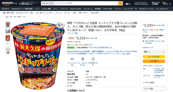 でりかおんどる監修スンドゥブチゲ風ラーメンは2025年12月8日から全国のコンビニやスーパーで販売しており、希望小売価格は税抜278円。Amazon.co.jpでは12個入りのセットを取り扱っており、税込3233円で購入できます。