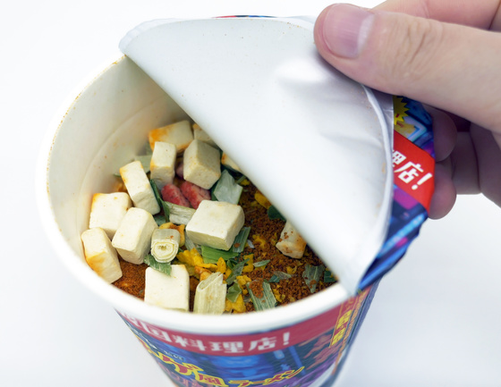 フタを開けると、豆腐やネギ、たまご、かまぼことたっぷりのかやくがありました。