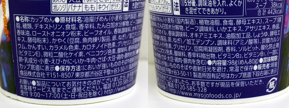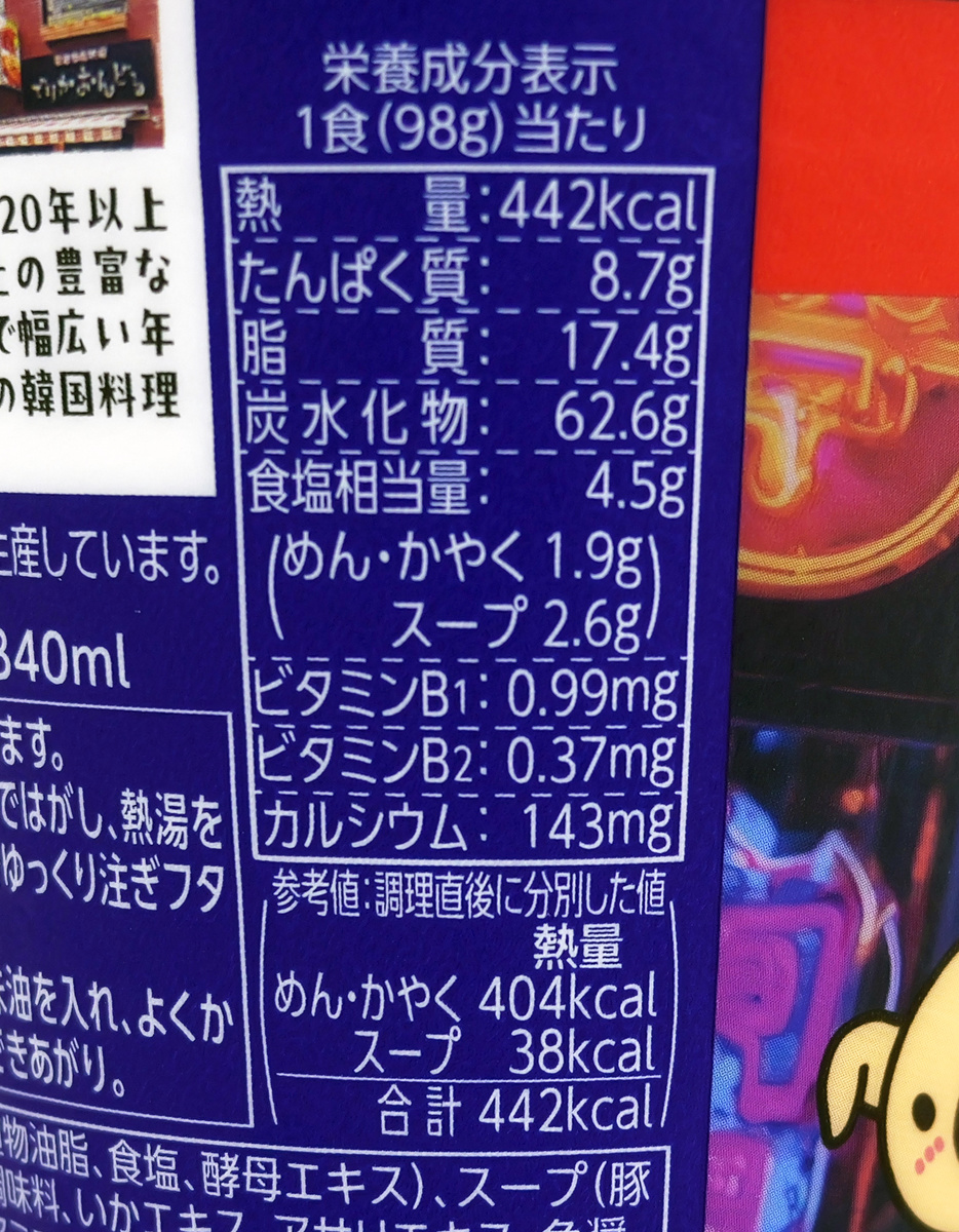1食当たりのカロリーはめんとかやくだけで404kcal、スープまで飲み干すと442kcalです。
