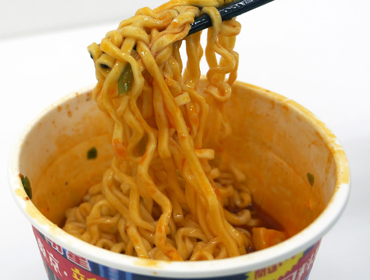 続いて麺を食べてみます。スープの辛みとうまみが縮れ麺にしっかり絡みついていて、ずずっとすすると刺激的な味わいです。辛さの中にしっかりと海鮮のうまみを感じられる食べごたえのあるカップ麺で、汗だくになるほど体が熱くなりながら夢中で食べ進めてしまいました。