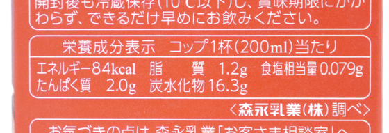 コップ1杯200ml当たり84kcalで、パック1杯飲みきった場合は189kcalです。