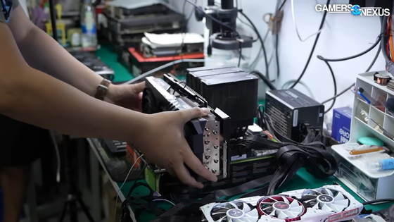 壊れたGPUを修理したり、スペックを改造して価値を高める「修理屋」は、メーカー保証がない密輸品を改造したり修理したりする役割を担います。ムービーでは、故障したRTX 4090からGPUチップとメモリを取り外し、新しい基板に移植し、メモリを倍の48GBに増設する「魔改造」が行われていました。