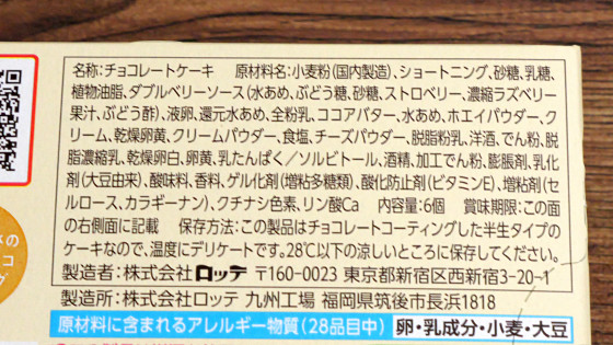名称はチョコレートケーキで、原材料には小麦粉、ショートニング、砂糖、ストロベリー、濃縮ラズベリー果汁、ココアパウダー、クリームなどが使われています。