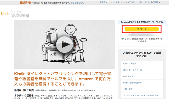 以下は、Amazonで本を出版する際に用いるKindleダイレクト・パブリッシング(KDP)のサインインページ。「サインイン」をクリックして、メールアドレスとパスワードを入力することでアカウントにアクセスできます。