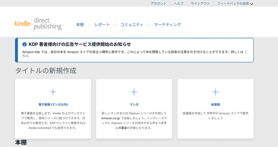通常はKDPにサインインすると、出版済みの本を一覧で見られる「本棚」や、本を購入したりKindle Unlimitedで読まれたりした数を確認できる「レポート」などを利用できます。