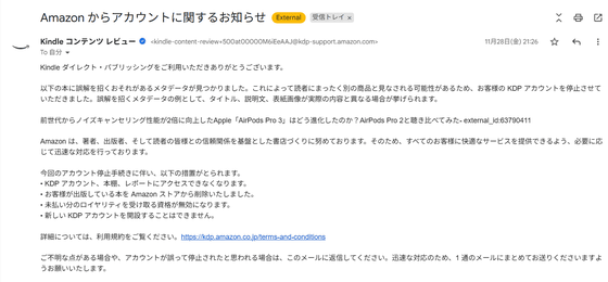 登録メールアドレスを確認したところ、「Amazonからアカウントに関するお知らせ」というメールが届いていました。メールによると、出版した本に「誤解を招くおそれがあるメタデータ」が見つかったため、KDPアカウントを停止したとのこと。