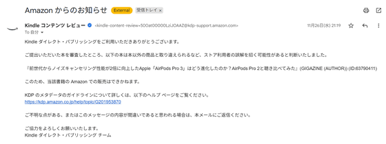 アカウントが停止される2日前に、本が「ストア利用者の誤解を招く可能性があると判断いたしました」「このため、当該書籍のAmazonでの販売はできかねます」と通知が届いていました。おそらく、この通知の後も他の書籍を出版し続けていたためアカウント停止に至ったのかと考えられますが、以下のメールはあくまで「当該書籍の販売」に関するものであり、アカウント停止に関するメッセージは含まれていませんでした。