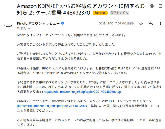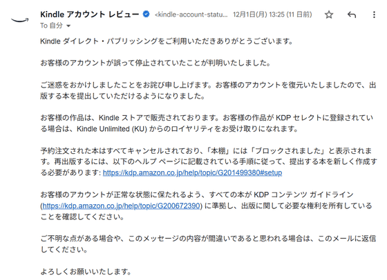 すると、約2時間で返信がありました。返信では「お客様のアカウントが誤って停止されていたことが判明いたしました。ご迷惑をおかけしましたことをお詫び申し上げます。お客様のアカウントを復元いたしましたので、出版する本を提出していただけるようになりました」とあり、アカウント停止が誤BANであることが記載されていました。