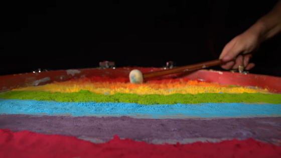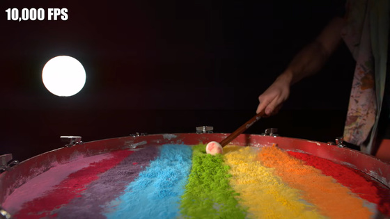 塗料がキレイに並んだ状態で、バスドラムをマレットでたたきます。超スローモーションの映像では、マレットがドラムヘッドに軽く沈む様子がよくわかります。