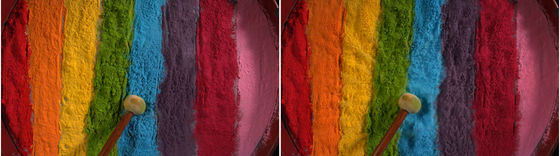 まずは過去のムービーと同じように、バスドラムの上に塗料を載せます。過去のムービーでは6色でしたが、今回は8色のグラデーションを作りました。