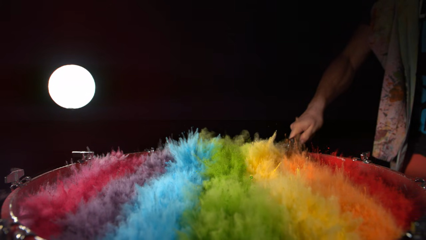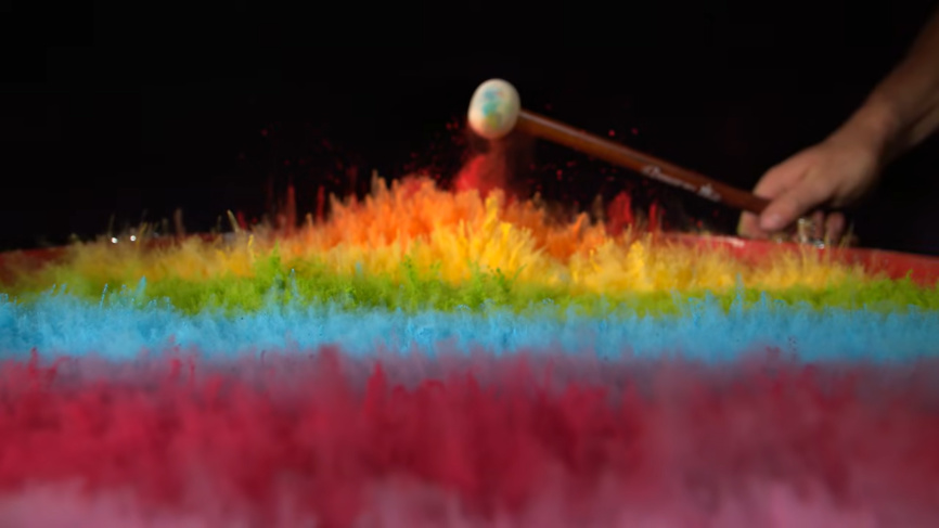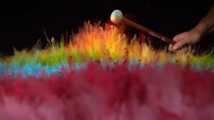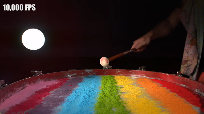 塗料がキレイに並んだ状態で、バスドラムをマレットでたたきます。超スローモーションの映像では、マレットがドラムヘッドに軽く沈む様子がよくわかります。