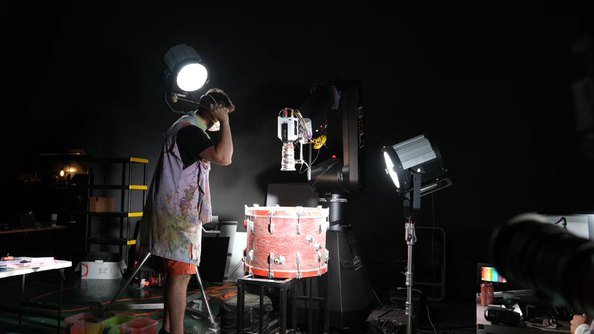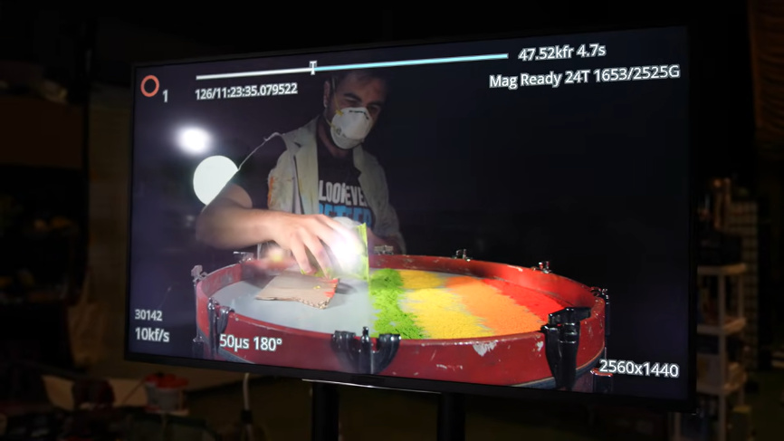 2016年のムービーは4Kで美しい映像を撮影することも目的としていたため、3000fps程度しか達成できず、衝撃波を詳細に捉えるにはコマ数が不足していたとギャビンさんは語っています。そのため、新しい企画では、フル解像度で9350fpsの撮影が可能なハイスピードカメラ 「T4040」を使って、より詳細にバスドラムの衝撃波を撮影することに挑戦しています。