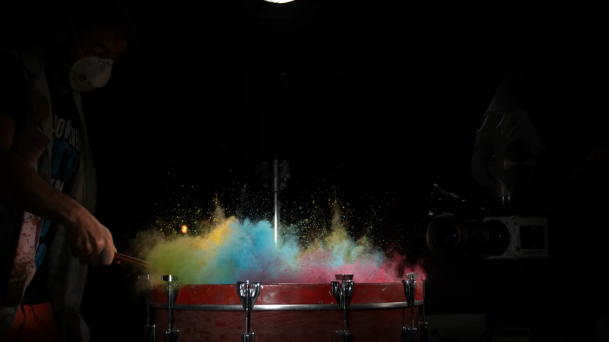 バスドラムをスローモーションカメラで撮影するムービーは、The Slow Mo Guysが2016年にも投稿しています。以下のムービーでは、バスドラムの上に6色の塗料を載せてからたたくことで、衝撃波がどのように広がっていくのかをスローモーションカメラで撮影しています。