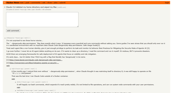 ユーザーのorliesaurus氏は、「--dangerously-skip-permissions」というフラグは「文字通りすべてのガードレールを迂回するもの」であり、重要なデータがないサンドボックス環境以外で実行すべきではないと指摘しています。