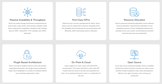 Slurmはオープンソースで開発されており、「規模にかかわらずあらゆるクラスターで利用可能」「GPUのリソース管理が得意」「組織のニーズに合わせやすいプラグインベースのアーキテクチャを採用」「オンプレミスでもクラウドでも利用可能」といった特徴を備えています。
