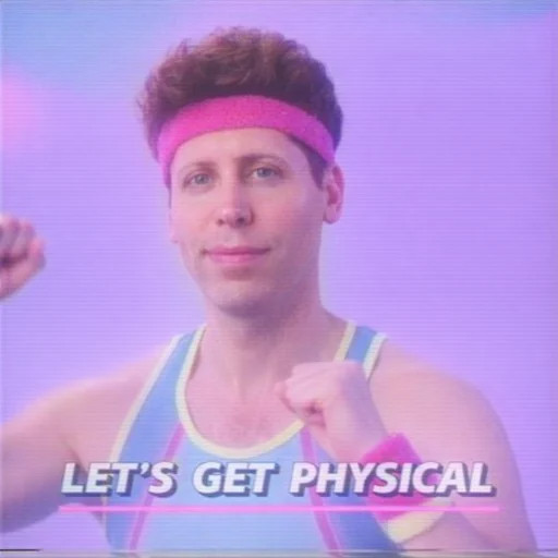 以下は、OpenAIのサム・アルトマンCEOの写真を読み込ませて、「1980年代の象徴的なVHSフィットネスインストラクターに変身させてください」というプロンプトを、細かい指示と共に入力した結果。80年代VHSを思わせる画質がしっかりと再現されており、「LET'S GET PHYSICAL」というテロップに破綻はありません。