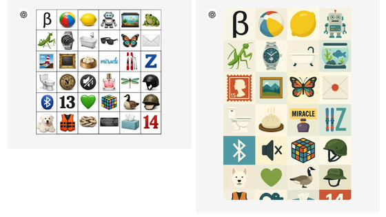 「6×6グリッドを描いて、そのマス目の中に指示した通りのイラストを描いて」という指示を、GPT Image 1.5(左)と前モデル(右)に与えた結果が以下。最初の6×6グリッドを描くという指示から、GPT Image 1.5の方がより正確であることがわかります。OpenAIは「要素間の関係性が意図通り維持され、より正確な編集とより複雑なオリジナル構成が可能になります」と述べています。
