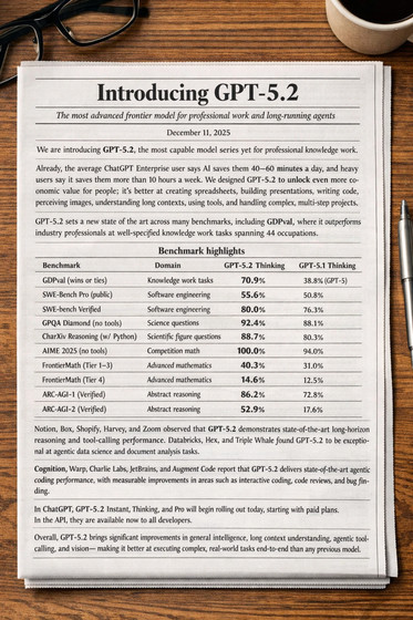また、テキストレンダリング能力が強化され、より高密度で小さなテキストやMarkdownを正確に描写できるようになっています。以下は、新聞記事風にGPT-5.2の特徴やベンチマーク結果をまとめた画像をGPT Image 1.5に生成させたもの。従来の画像生成AIでは、画像の中に描かれる文字は形が破綻して文字ではなくなってしまうことがよくありますが、GPT Image 1.5が生成した画像には細かい文字が正確に書かれています。