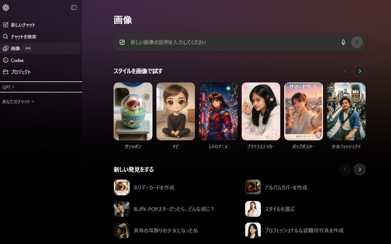 また、ChatGPTではメッセージに表示したい内容を記述して画像を生成する機能に加えて、画像専用のホームが導入されました。画像専用のホームでは、数十種類のプリセットフィルターとプロンプトが用意されているほか、画像生成用のプロンプトのヒントも提示されます。
