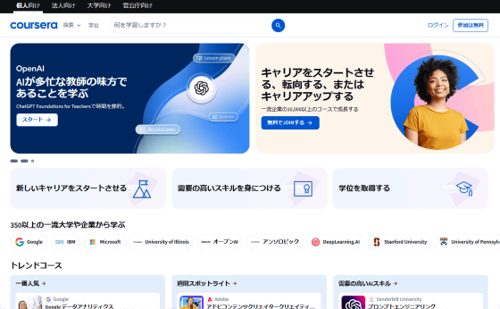 CourseraはGoogleやMicrosoft、スタンフォード大学といった企業および機関が作成したオンライン講座を多数ラインナップしているプラットフォームです。