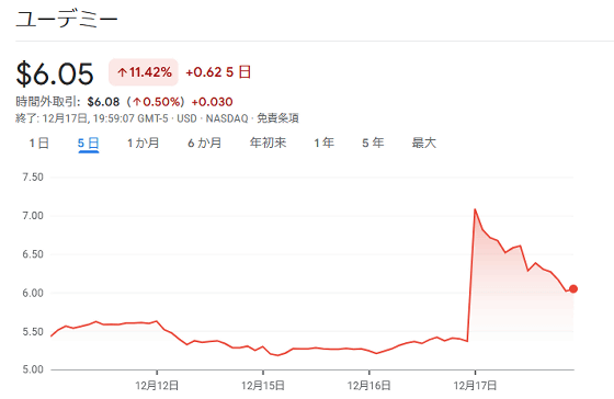 両社は2025年12月17日に合併に関する契約を締結したことを発表しました。買収取引は株式交換の形式で実行され、CourseraがUdemyの全株式を取得します。また、Udemyの株主は1株当たりCourseraの株式を0.8株受け取ります。買収の発表を受けて、Udemyの株式は急騰しました。