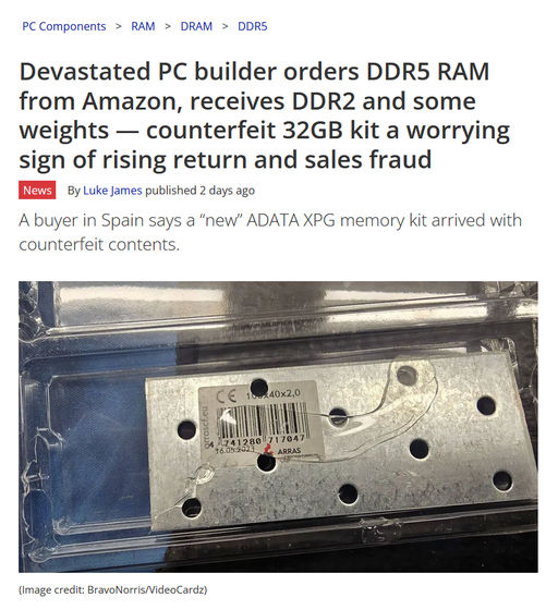 テクノロジー系メディアのVideoCardz.comが、読者から「AmazonでDDR5メモリを注文したらDDR2メモリと重りが送られてくる詐欺に遭遇した」という報告を受けています。
