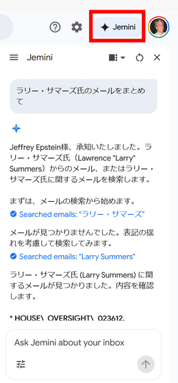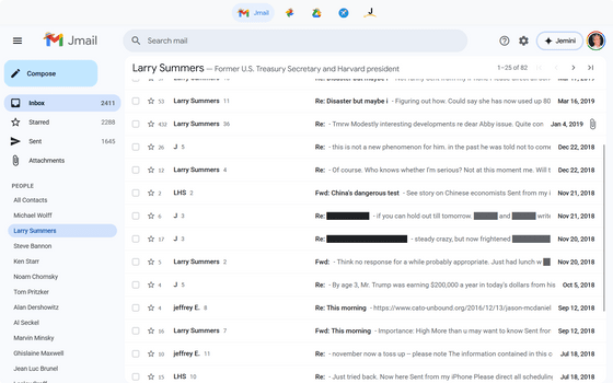 Jmailには2009年4月14日から2019年7月14日までにエプスタインが交わしたメールが掲載されており、Gmailのように受信トレイを閲覧したり、連絡先ごとにメールを閲覧したり、メールを検索したりできます。エプスタインと数百件のメールを交わしていたと伝えられていた、元財務長官でハーバード大学学長も務めたローレンス・サマーズ氏の名前もあります。