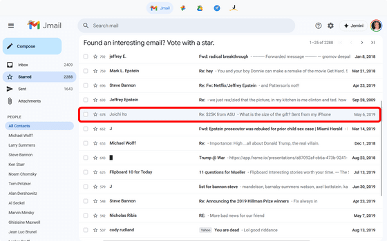 「Starred(スター付き)」をクリックすると、Jmailのユーザーが星を付けて投票したメール一覧を閲覧できます。中には、エプスタインから資金提供を受けていたマサチューセッツ工科大メディアラボ元所長の伊藤穣一氏の名前もありました。