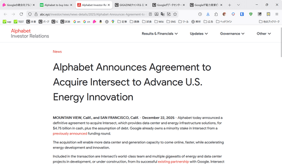 Alphabetは2024年12月にIntersect Powerの資金調達ラウンドに参加して少数株主持分を取得し、データセンターとクリーンエネルギーの開発で提携していました。