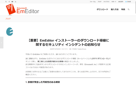 2025年12月23日にEmurasoftが発表したところによると、EmEditor公式サイトのダウンロード導線上に存在する「今すぐダウンロード」ボタンに関し、第三者による改変が疑われる事象を確認したとのこと。