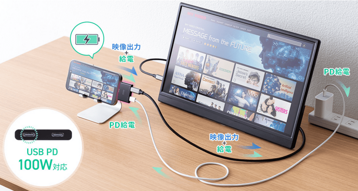 デバイスのUSB Type-Cポートが1つしかない場合は給電しながらの映像出力は困難ですが、この拡張アダプタを使えば給電しながらの出力が可能です。