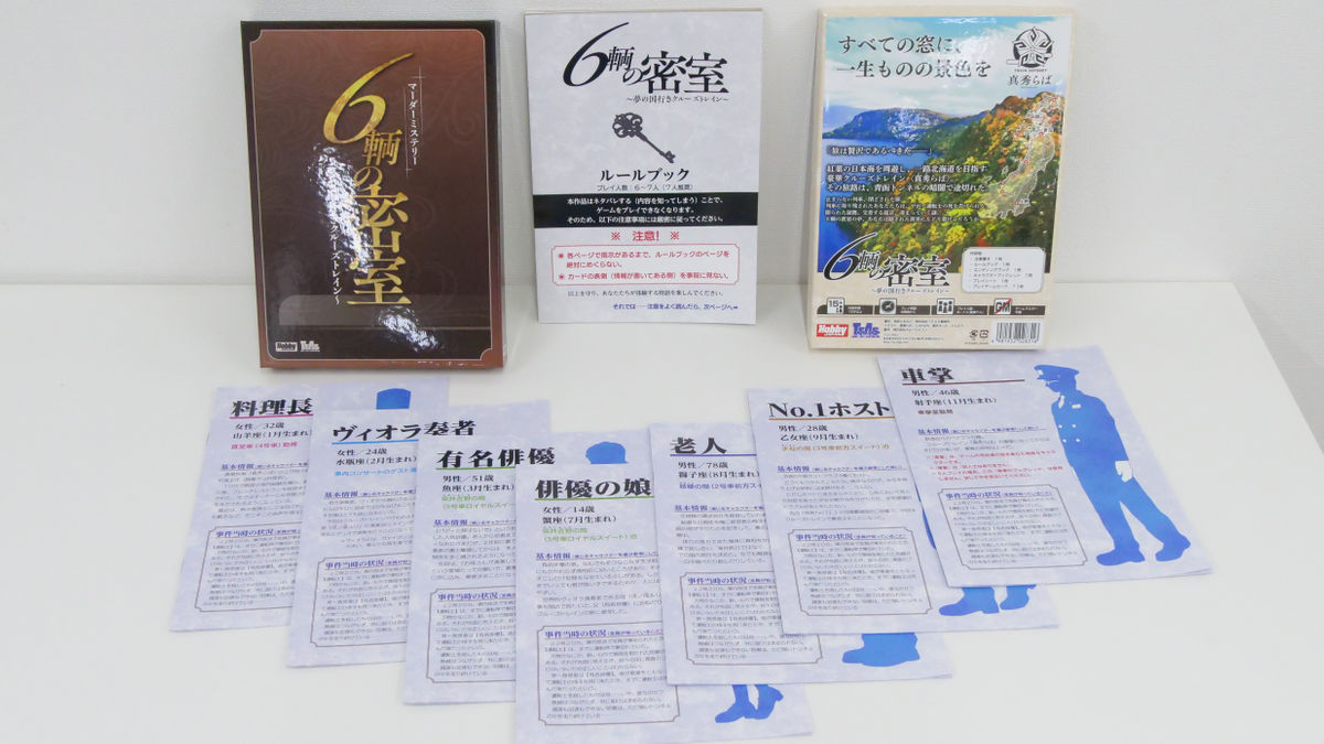 ホビージャパンから提供してもらった「マーダーミステリー」のプレイセットです。マーダーミステリーとは、プレイヤーが殺人事件の登場人物になりきり、犯人役や探偵役などをこなしつつ推理を行う会話型パーティーゲームのこと。この作品では、北海道を目指す豪華クルーズトレインで起きた事件を解明することになります。対象年齢は15歳以上、プレイ時間は4時間~、プレイ人数は6~7人(推奨7人)。GM(ゲームマスター)不要でプレイできます。