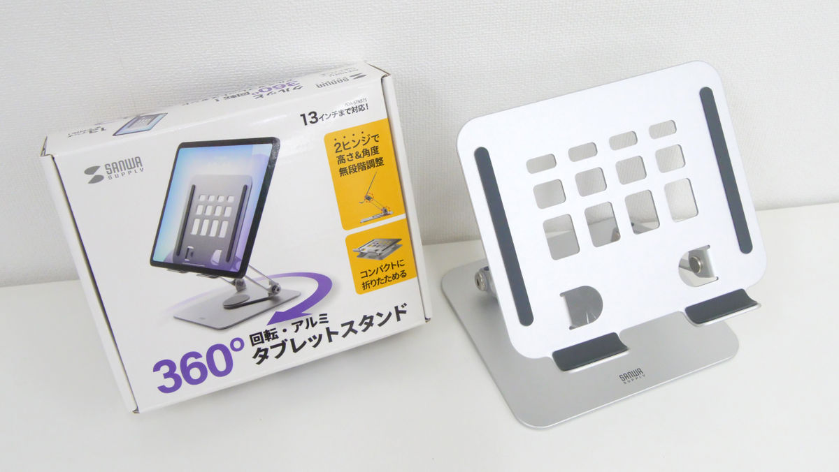 台座部分が360度回転するアルミ製のタブレットスタンドです。耐荷重は1kg。サンワサプライから提供してもらいました。