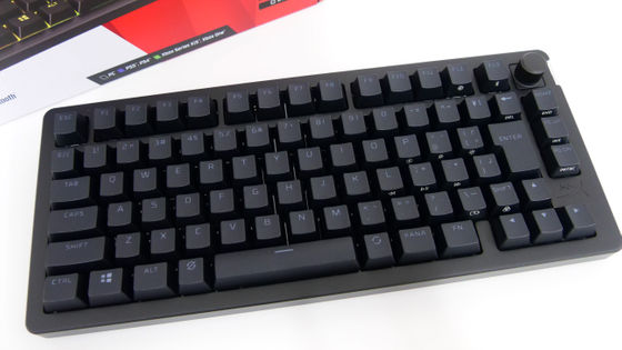 テンキーレスの75%サイズで、基本的なキーのほかに再生、停止、早送り、早戻しの操作が可能なコントロールキーが右上に配置されています。キーのタイプはリニアスイッチ(赤軸)。