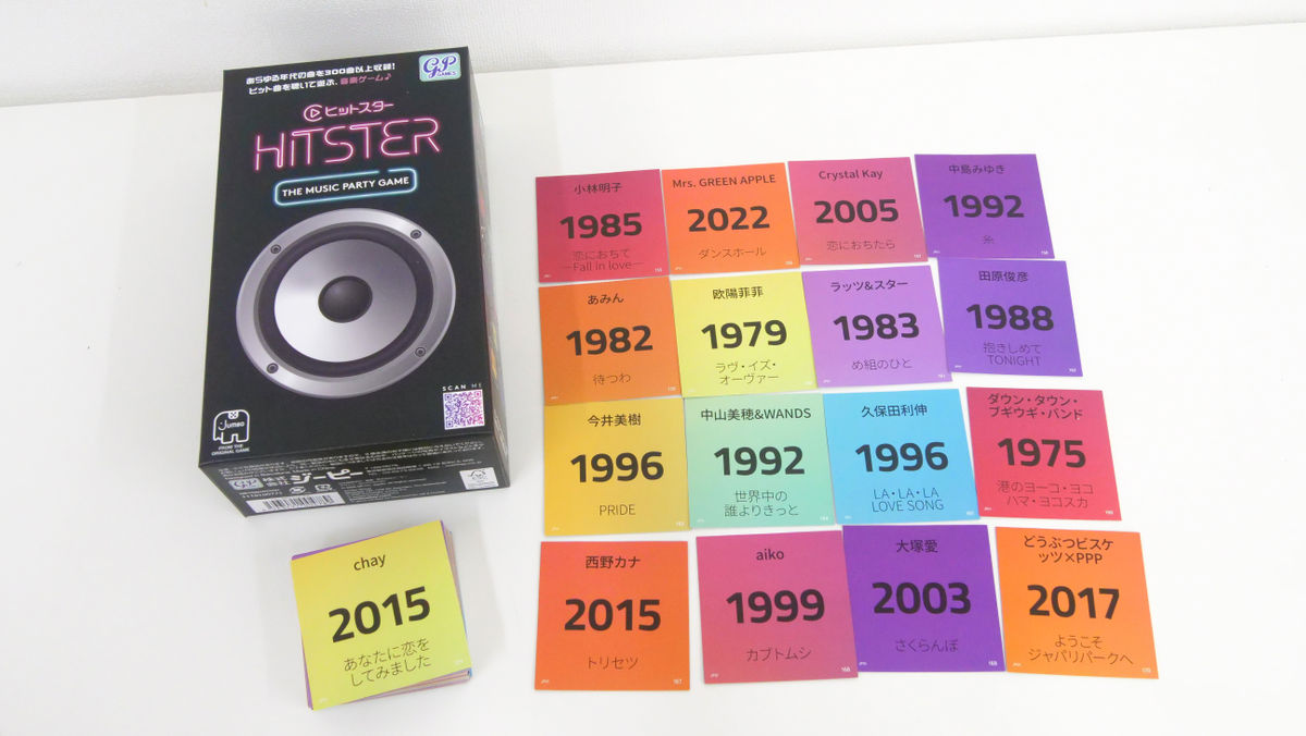 実在する曲の名前が書かれたカードを並べ、スマートフォンアプリで音楽を再生してリリースされた年を予想するパーティーゲームです。ジーピーから提供してもらいました。昭和の懐メロから2024年の最新楽曲まで、日本でヒットしたあらゆる年代の曲を300曲以上収録しています。