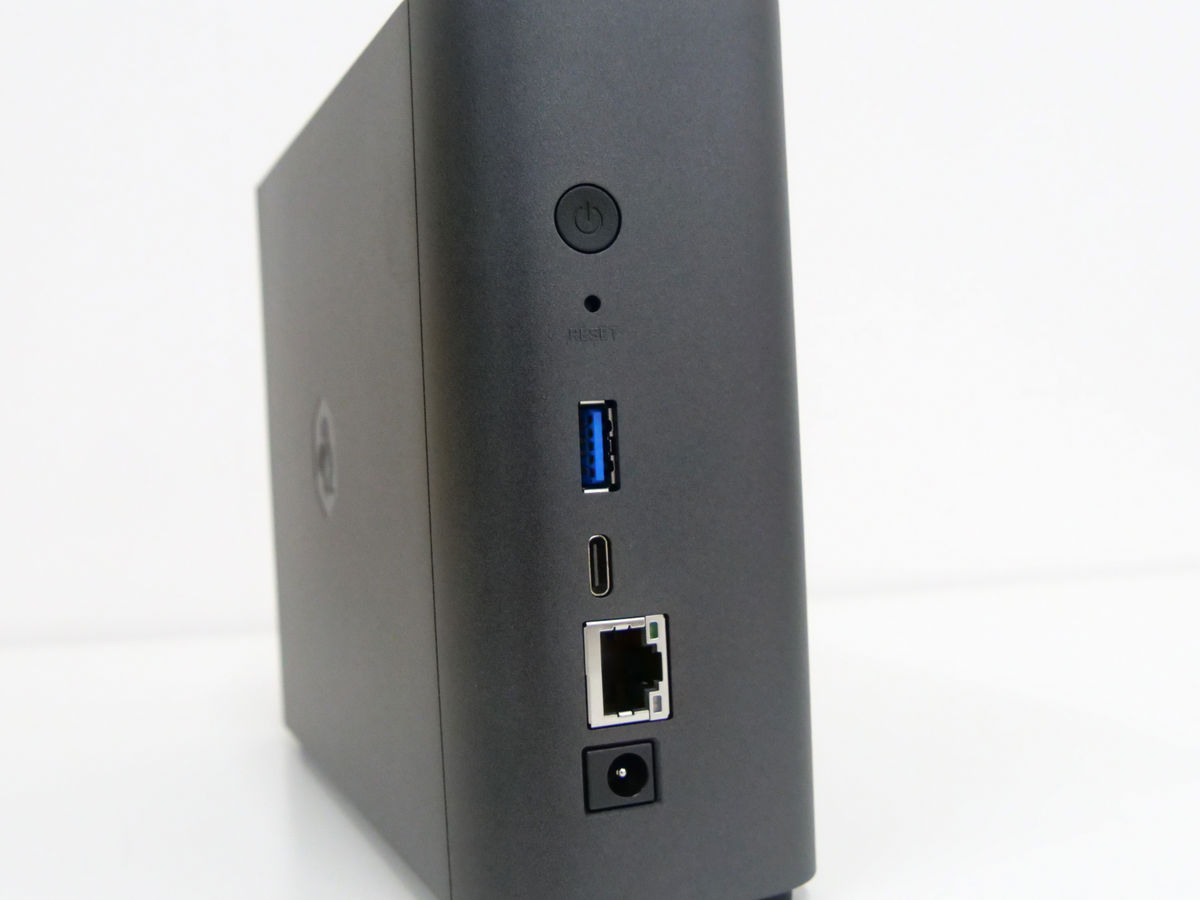 正面に電源ボタンとリセットボタン、USB-A 3.2 Gen 1、USB-C 3.2 Gen 1、1GbE RJ-45、電源ポートがあります。