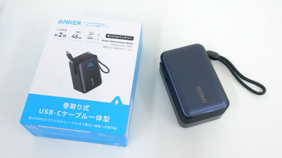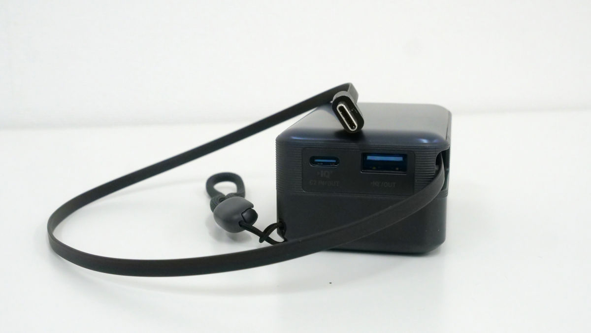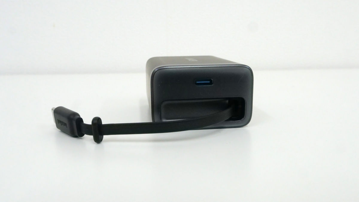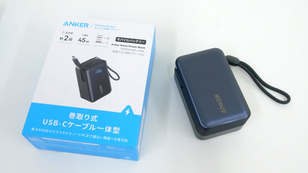 重さは約230g、容量は1万mAhで、USB Type-CポートとUSB Type-Cケーブルから最大45Wの出力が可能。入力は最大30Wです。巻取り式のケーブルは約70cmまで伸縮できます。