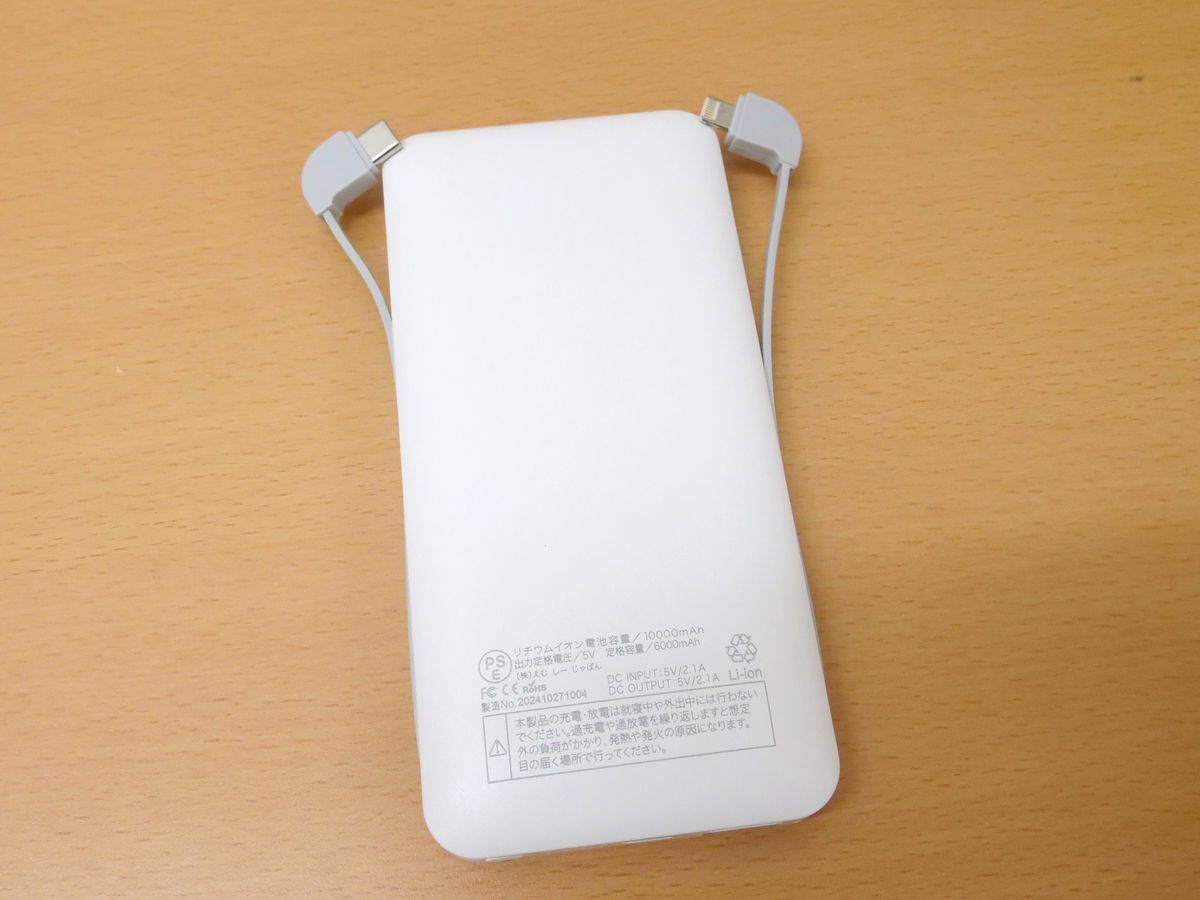 モバイルバッテリーの定格容量は6000mAh。USB Type-CポートとUSB Type-Aポートが1つずつ、本体に一体化されたUSB Type-CケーブルとLightningケーブルが1本ずつ備わっています。