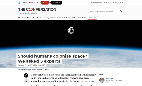 宇宙開発が進むにつれて「月や火星に人類のコロニーを築く」という計画が現実味を帯びていますが、根本的な疑問として「人類は宇宙を植民地にするべきなのか?」というものがあります。この疑問について5人の専門家に尋ねた結果を、学術系メディアのThe Conversationがまとめています。