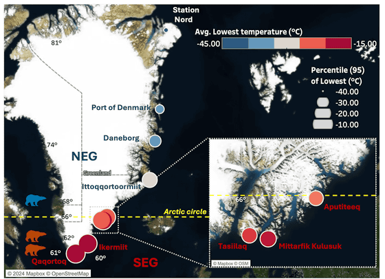 ホッキョクグマが生息しているグリーンランドでは、北東部と南東部の気温に大きな差があることが近年の研究で判明しています。また、北東部は北極ツンドラであるのに対し、南東部は森林ツンドラに覆われており降水量が多く風が強い厳しい環境となっており、モデル研究では40年以内に南東部のホッキョクグマの個体数が90%以上減少する可能性が高いと考えられています。以下の図はホッキョクグマの生息地であるグリーンランドの沿岸における気温をデンマーク気象研究所のデータから視覚化したもの。