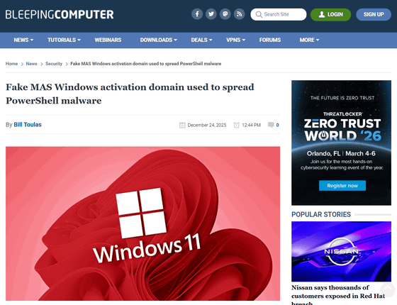 WindowsやMicrosoft Officeのライセンス認証ができるというオープンソースツール「Microsoft Activation Scripts(MAS)」で、アクティベーションに利用しているドメインにそっくりな名前を用いたタイポスクワッティングにより、悪意あるPowerShellスクリプトでマルウェアに感染させられる被害が出ていることが明らかになりました。