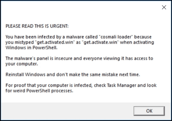「至急お読みください。あなたは『cosmali loader』と呼ばれるマルウェアに感染しました。これは、PowerShellでWindowsをアクティベートする際に、『get.activated.win』を『get.activate.win』と誤って入力したためです。このマルウェアの管理パネルは安全ではなく、それを閲覧している誰もがあなたのコンピューターにアクセスできます。Windowsを再インストールし、次回は同じ間違いをしないでください。コンピューターが感染している証拠として、タスクマネージャーを確認し、不審なPowerShellプロセスを探してください。」