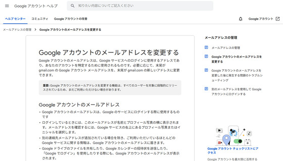 なお、 「Googleアカウントのメールアドレスを変更する機能は、すべてのユーザーを対象に段階的にリリースされているため、まだご利用いただけない場合があります」とのことで、記事作成時点ではすべてのユーザーがメールアドレスを変更できるわけではありません。
