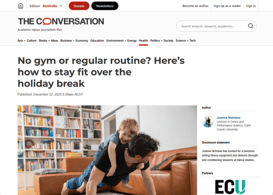 年末年始などの長期休みは誰にとってもうれしいものですが、旅行や帰省などで忙しくてジムに行く暇がなかったり、通っているスポーツクラブが休みになったりして、コツコツ積み重ねてきた運動習慣がなくなってしまうというデメリットもあります。オーストラリアのエディス・コーワン大学の運動科学者であるジョアンナ・ニコラス氏が、「長期休みの間も運動を続けるためのアドバイス」をしています。