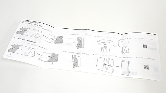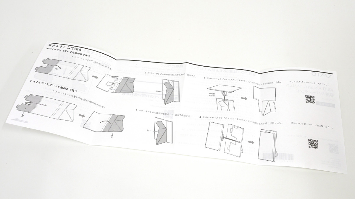 スタンドとして使うときは、折りたたみ方によって「ディスプレイを空中に浮かせる」と「ディスプレイを縦向きにして立たせる」という2種類の設置方法を選べます。折りたたみ方は説明書でイラスト付きで解説されています。